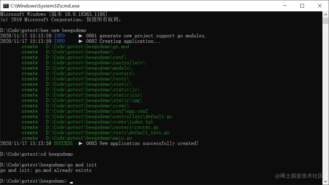 然后,需要进入 beegodemo 文件夹下,如果没有 go mod 文件,需要 init 一下: