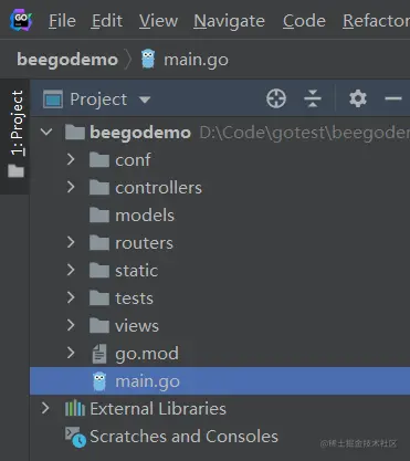 使用 Goland 打开 beegodemo 文件夹,可以看到这个项目: