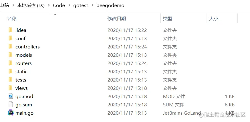 此时 beegodemo 文件夹下应该有这些文件: