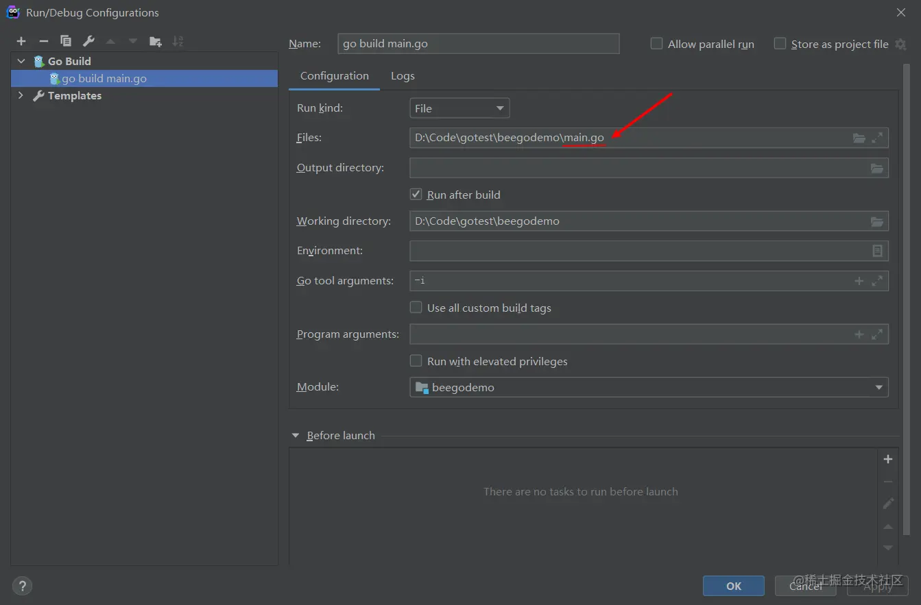 此时配置 Goland 右上角运行项目的配置,参考我之前写的文章,主要就是这一栏需要定位到 main.go 文件: