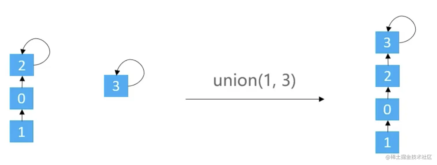 比如下图,将左边的值合并到右边:union(v1,v2)就是将与v1父字节点一样的结点都将自己的父节点改为v2的父节点。