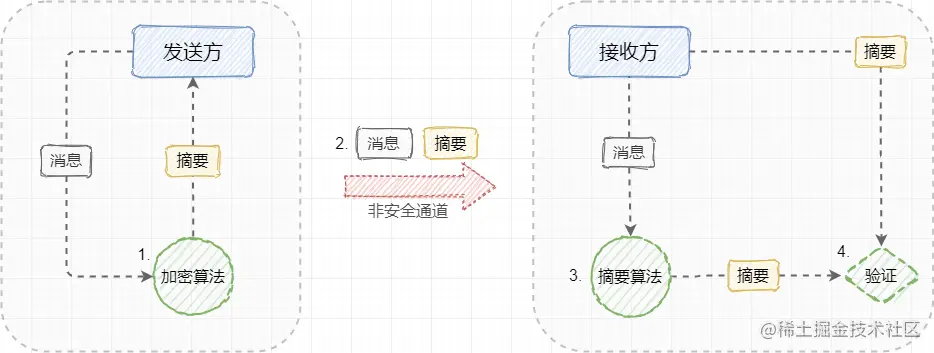 - 4、接收方验证两个摘要是否相同