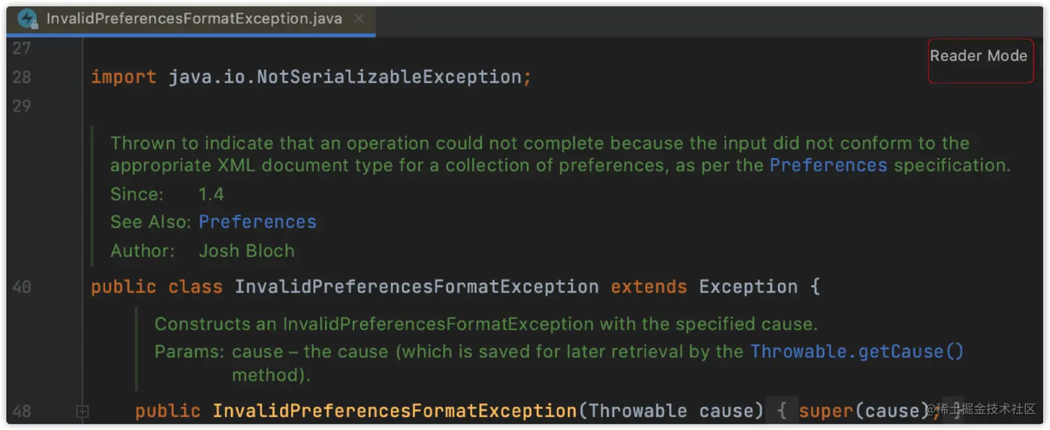 现在,我们如果打开二方包类、文件或者说其他只读文件,IDEA 将会默认在阅读器模式下打开。