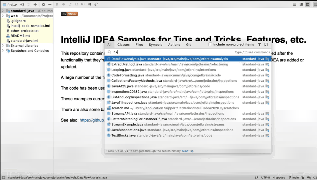 这个版本我们可以在 Search Everywhere 窗口中,直接使用 git 提交记录哈希和消息、标记以及分支进行快速的查找。