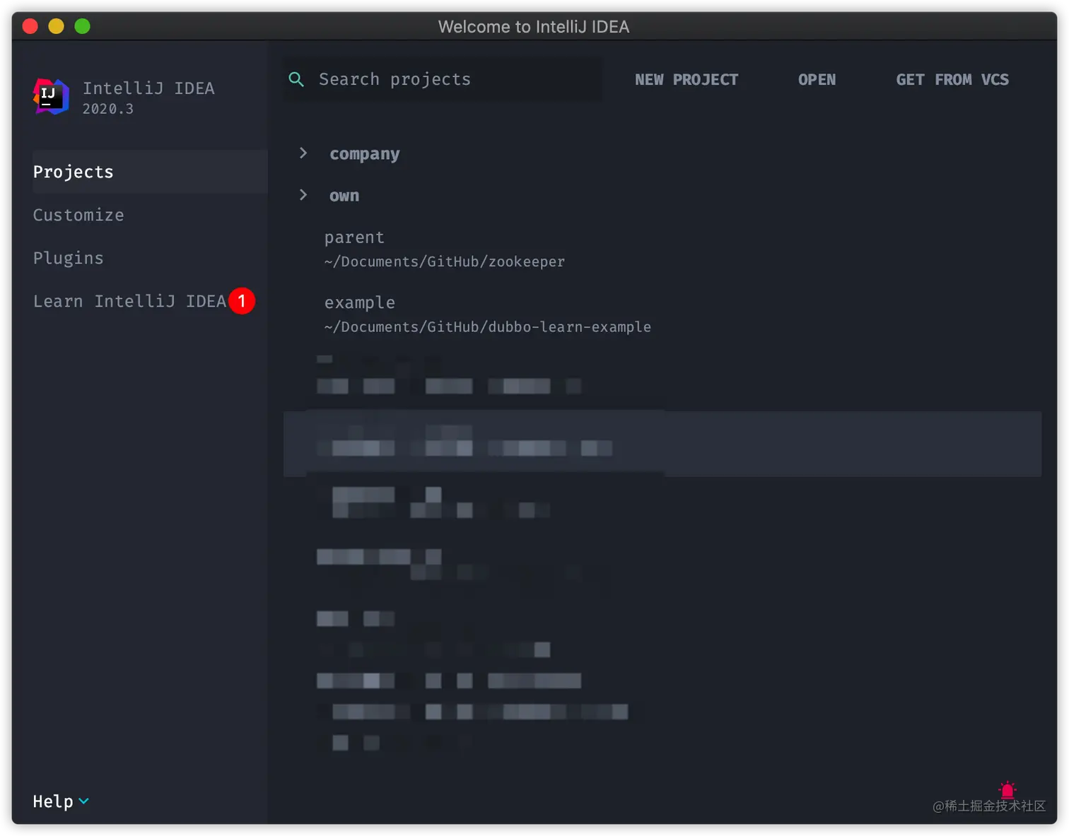 IDEA 欢迎窗口全新升级,首页增加三个选项卡,一个用于设置 IDE 界面的 Customize,一个用于插件安装的 Plugins,一个于访问帮助和学习资源的 Learn IntelliJ IDEA,另外包括之前用于管理项目的 Projects。
