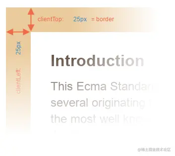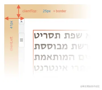 在有滚动条时,并且浏览器将这些滚动条放置在左侧或顶部(操作系统为阿拉伯语或希伯来语),clientLeft 和 clientTop 还包含这些滚动条的宽度。