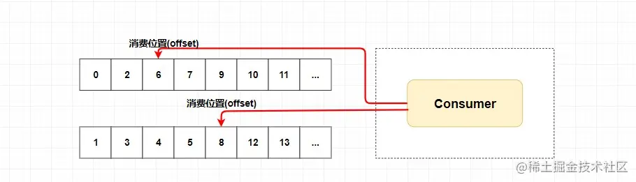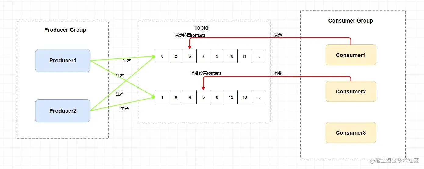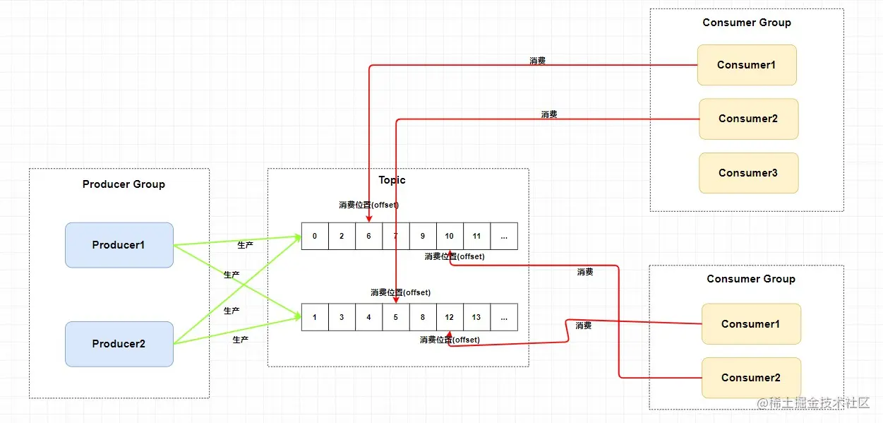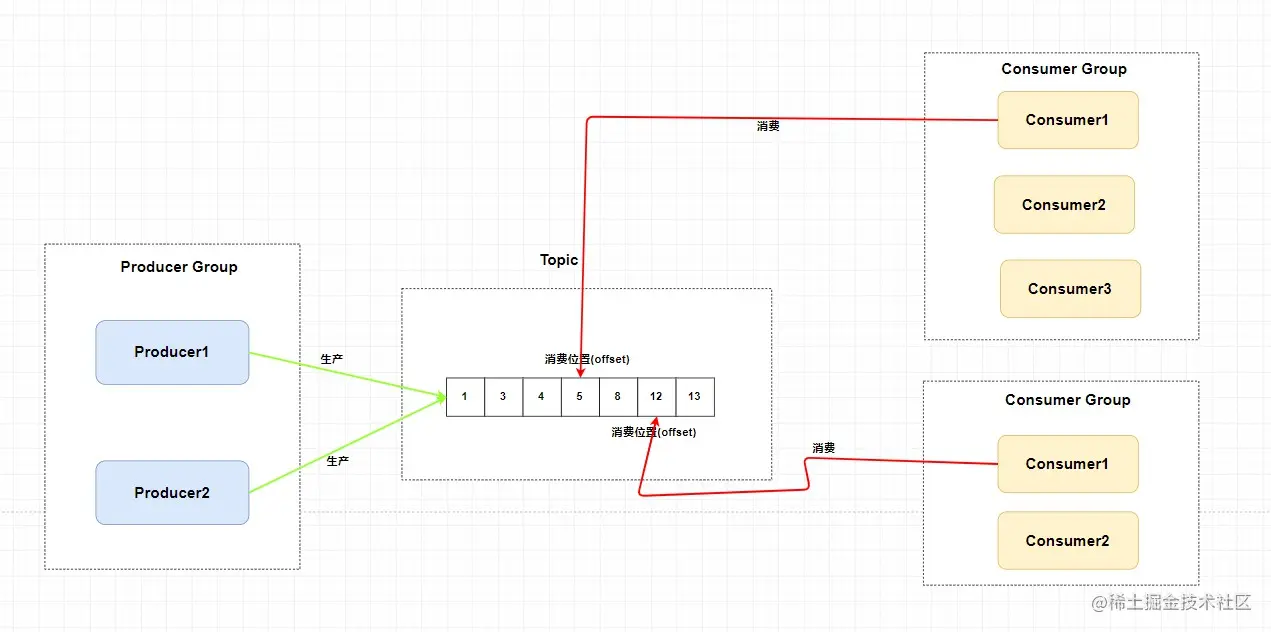 因为我们刚刚画的仅仅是一个消费者组,我们知道在发布订阅模式中一般会涉及到多个消费者组,而每个消费者组在每个队列中的消费位置都是不同的。如果此时有多个消费者组,那么消息被一个消费者组消费完之后是不会删除的(因为其它消费者组也需要呀),它仅仅是为每个消费者组维护一个 消费位移(offset) ,每次消费者组消费完会返回一个成功的响应,然后队列再把维护的消费位移加一,这样就不会出现刚刚消费过的消息再一次被消费了。