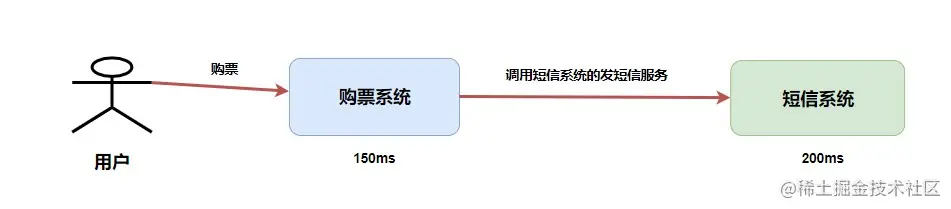 我们省略中间的网络通信时间消耗,假如购票系统处理需要 150ms ,短信系统处理需要 200ms ,那么整个处理流程的时间消耗就是 150ms + 200ms = 350ms。