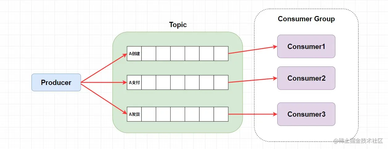 我们可以看到在整个图中有 Producer Group 、Topic 、Consumer Group 三个角色,我来分别介绍一下他们。