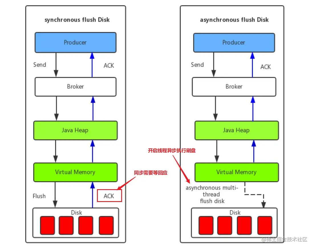 如上图所示,在同步刷盘中需要等待一个刷盘成功的 ACK ,同步刷盘对 MQ 消息可靠性来说是一种不错的保障,但是 性能上会有较大影响 ,一般地适用于金融等特定业务场景。