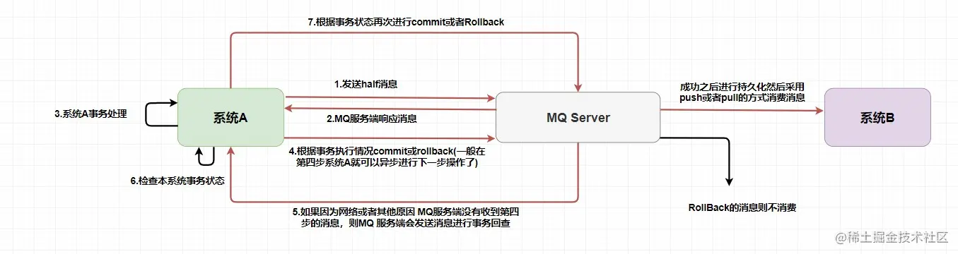 你还需要注意的是,在 MQ Server 指向系统B的操作已经和系统A不相关了,也就是说在消息队列中的分布式事务是——本地事务和存储消息到消息队列才是同一个事务。这样也就产生了事务的最终一致性,因为整个过程是异步的,每个系统只要保证它自己那一部分的事务就行了。