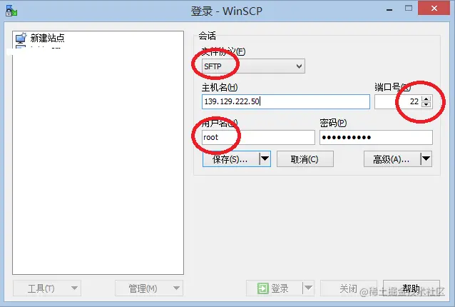 根据下图示例填写您的信息,用户名填写root,密码是您的服务器密码,点击“保存”后,再点击“登录”。