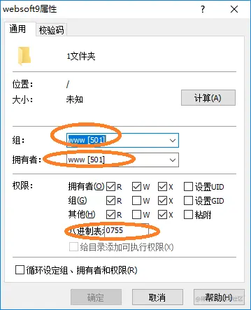 循环设定组、拥有者和权限建议打钩,这样当前文件夹以下的目录都会生效。