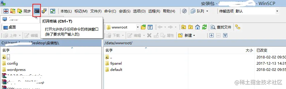 WinSCP登录到服务器,点击菜单来的命令窗口图标(快捷键Ctrl+T也可以)。