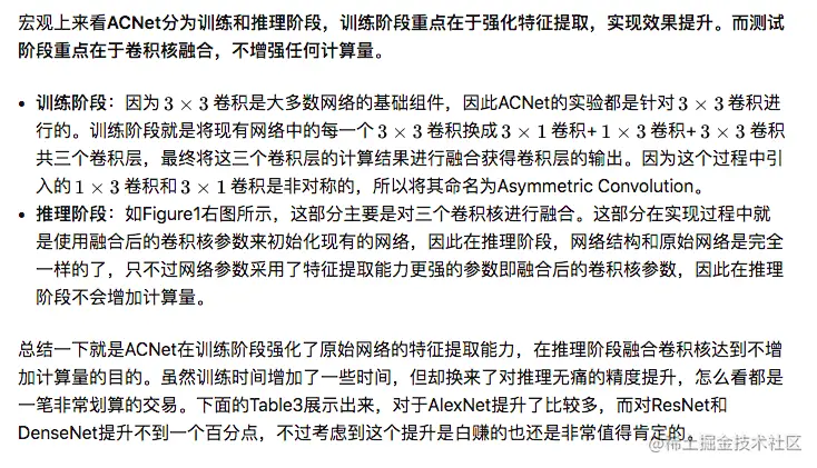 这部分的原因个人理解是来自梯度差异化,原来只有一个[公式]卷积层,梯度可以看出一份,而添加了1x3和3x1卷积层后,部分位置的梯度变为2份和3份,也是更加细化了。而且理论上可以融合无数个卷积层不断逼近现有网络的效果极限,融合方式不限于相加(训练和推理阶段一致即可),融合的卷积层也不限于1x3或3x1尺寸。