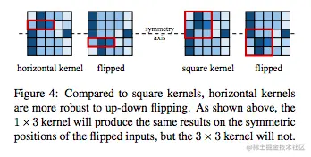 效果上看,模型在ImageNet上是有一定的效果的。为什么会有这样的提升呢?论文中给出了一种解释,因为1x3和3x1的卷积核对于竖直翻转和水平翻转是有鲁棒性的。看下图: