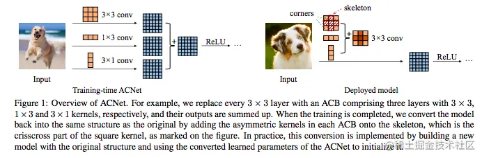 - 图片分为左右两个部分,左边是训练阶段的ACNet,右边是部署的模型,可以理解为测试推理阶段;