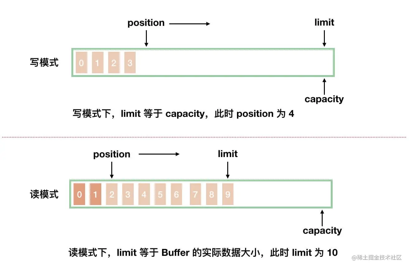 - 读模式下:在Buffer完成所有数据写入后,通过调用flip()方法,切换到读模式,此时limit等于Buffer中实际已经写入的数据大小。因为Buffer可能没有被写满,所以limit<=capacity