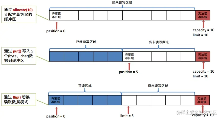Buffer写入可以通过put()和channel.read(buffer)两种方式写入。 通常我们NIO的读操作的时候,都是从Channel中读取数据写入Buffer,这个对应的是Buffer的写操作。