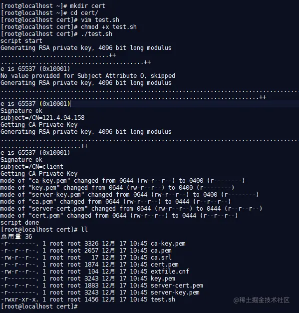 - 创建/进入你要存放证书的目录,复制上面的脚本到你服务器中的test.sh,运行脚本文件 生成证书