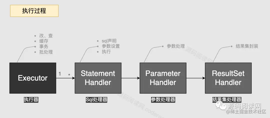 **执行器:**Executor, 处理流程的头部,主要负责缓存、事务、批处理。一个执行可用于执行多条SQL。它和SQL处理器是1对N的关系。