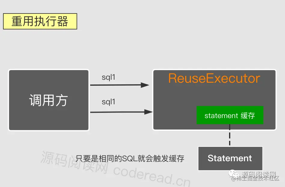 ReuseExecutor可重用执行器的特点是,可重复使用JDBC中Statement,减少预编译次数。该执行器在执行SQL时会把Statement缓存起来,如果下次碰到相同的SQL,就会取出来使用。