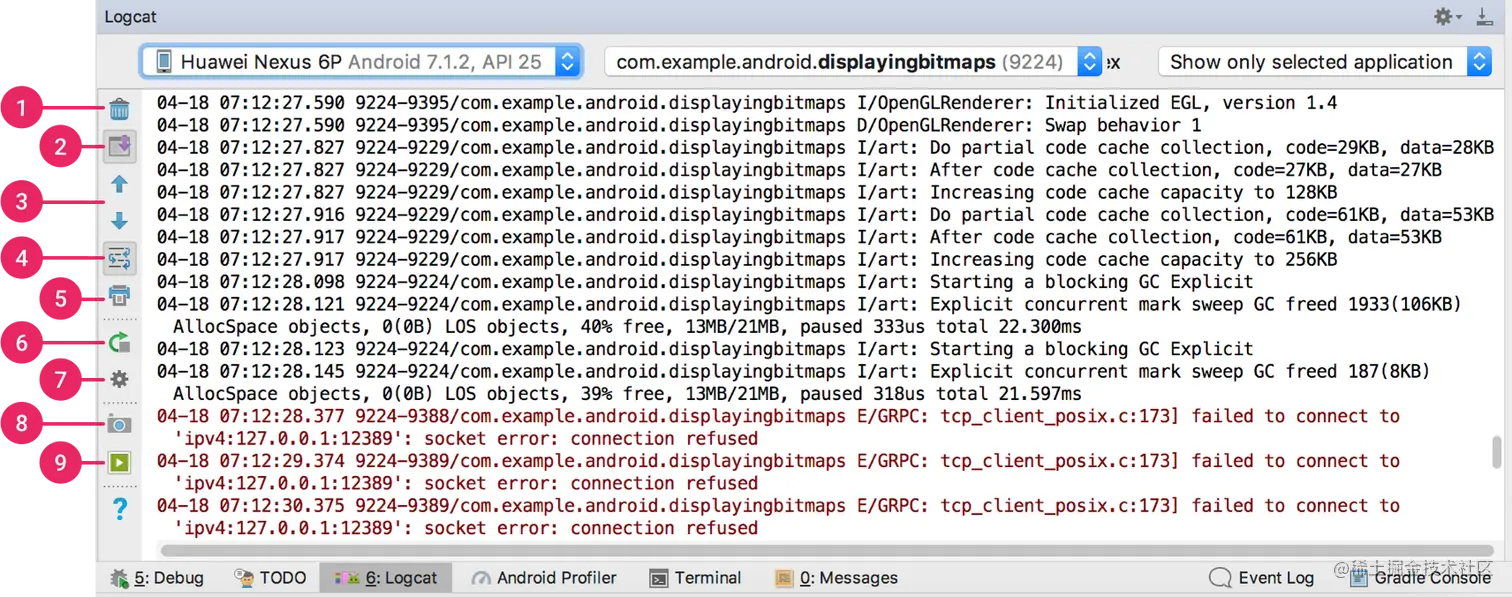 在设备上构建和运行应用。 依次点击 View > Tool Windows > Logcat(或点击工具窗口栏中的 Logcat 图标 )。 Logcat 窗口会显示所选应用(从窗口顶部的下拉列表中选择)的日志消息,如图 1 所示。