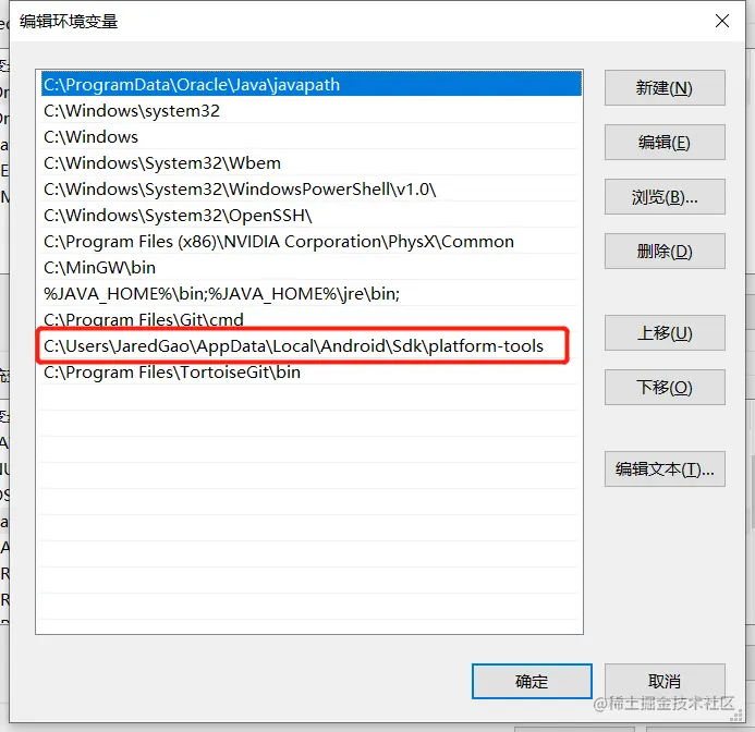 2.然后把他的路径粘贴到系统变量path那里,这样,系统就可以找到adb.exe了