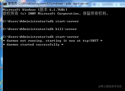 3.然后你就可以在命令提示符中开启关闭adb了