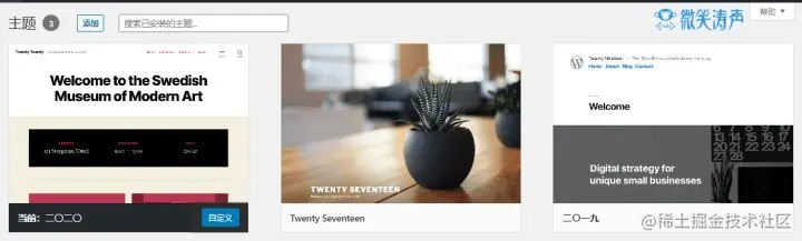 12、回到后台,点击外观—主题,可以看到默认有3个主题,也可以在主题商店或者自己下载然后进行安装。