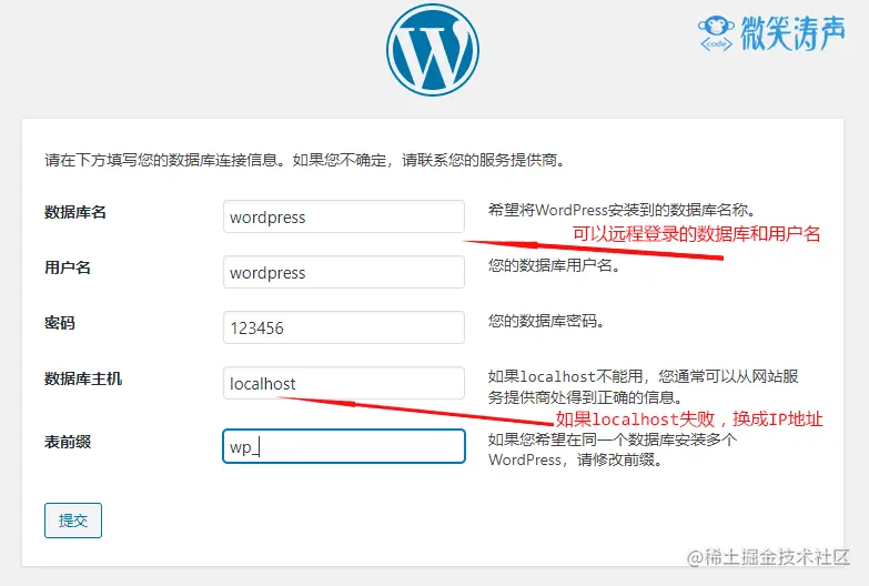 4、根据提示输入相对于的信息。注意:数据库用户填写可以远程访问的。数据库主机建议填写IP地址。点击提交。如果提交以后出现错误,根据提示操作即可。