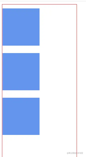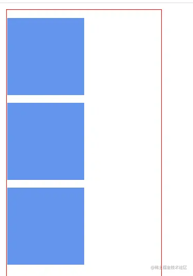 如图所示,给每个蓝色盒子均添加margin:10px 0的属性,那么按理来说两个蓝色盒子之间距离应该为20px,然而发生边距塌陷,只有10px。此时,若给中间第二个每个蓝色盒子创建一个新的BFC,则会解决边距塌陷问题。