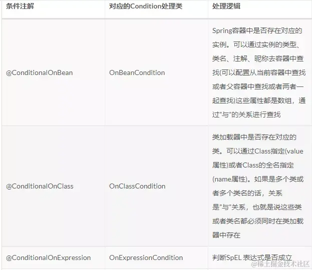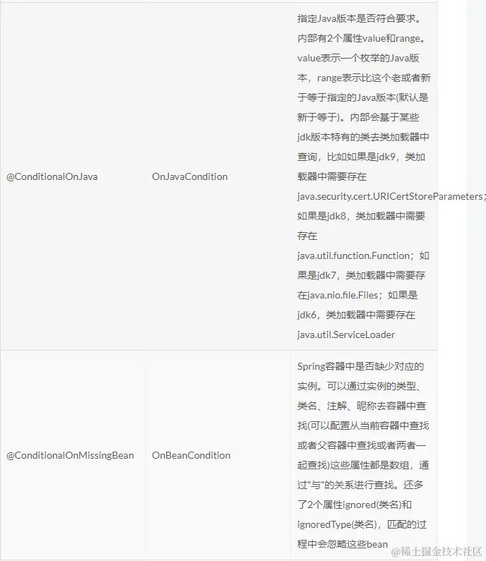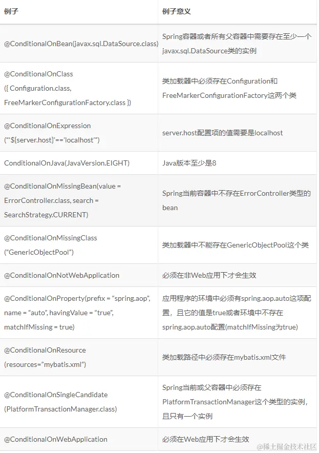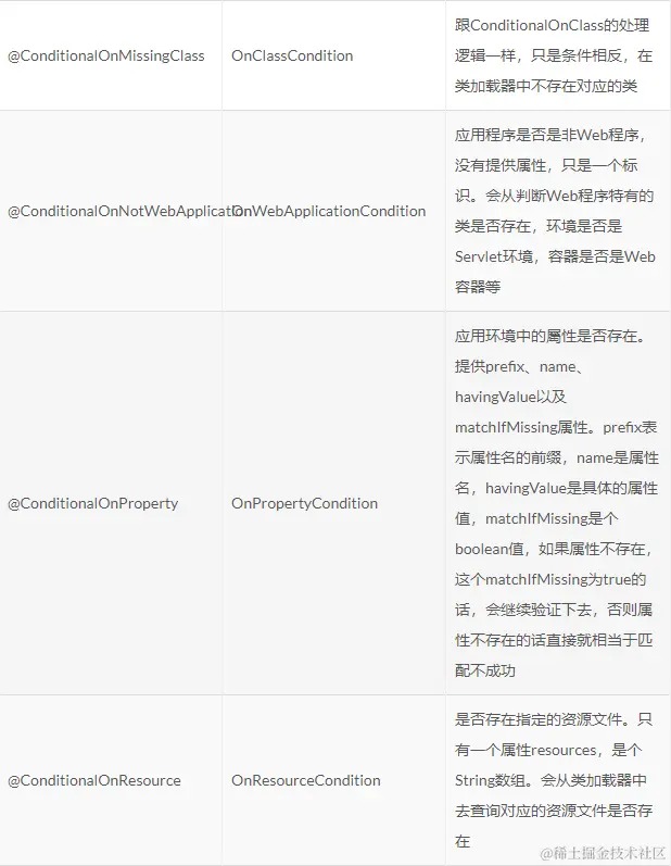 SpringBoot还提供了其他比如ConditionalOnJava、ConditionalOnNotWebApplication、ConditionalOnWebApplication、ConditionalOnResource、ConditionalOnProperty、ConditionalOnExpression等条件注解,有兴趣的读者可以自行查看它们的底层处理逻辑。