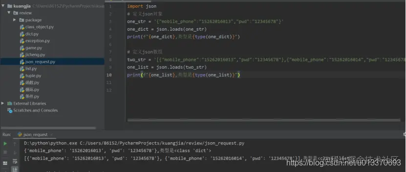 1、Json对象(转为字典)/json数组(转为列表,元素为字典): json.loads:将json字符串转为python的字典:{ }
