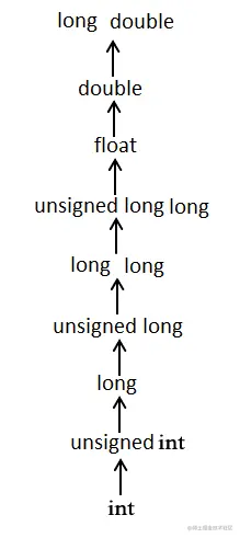 常用的算术转换是隐式地把值强制转换为相同的类型。编译器首先执行整数提升,如果操作数类型不同,则它们会被转换为下列层次中出现的最高层次的类型: