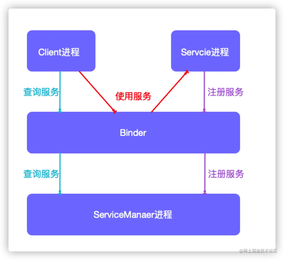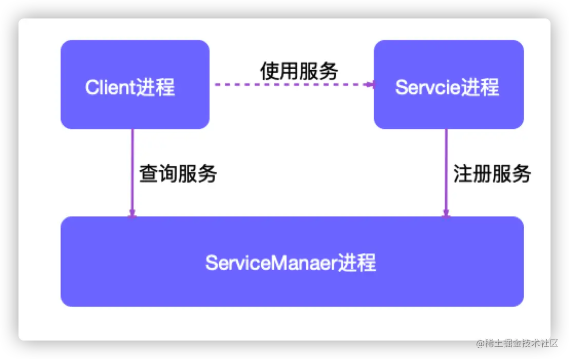 但是发现,ServiceManager属于一个单独的进程,Client/Service和ServiceManager都存在着进程隔离,如此,Servcie注册到ServiceManager进程依然需要Binder去完成,所以最终的进程间通信应该如下所示