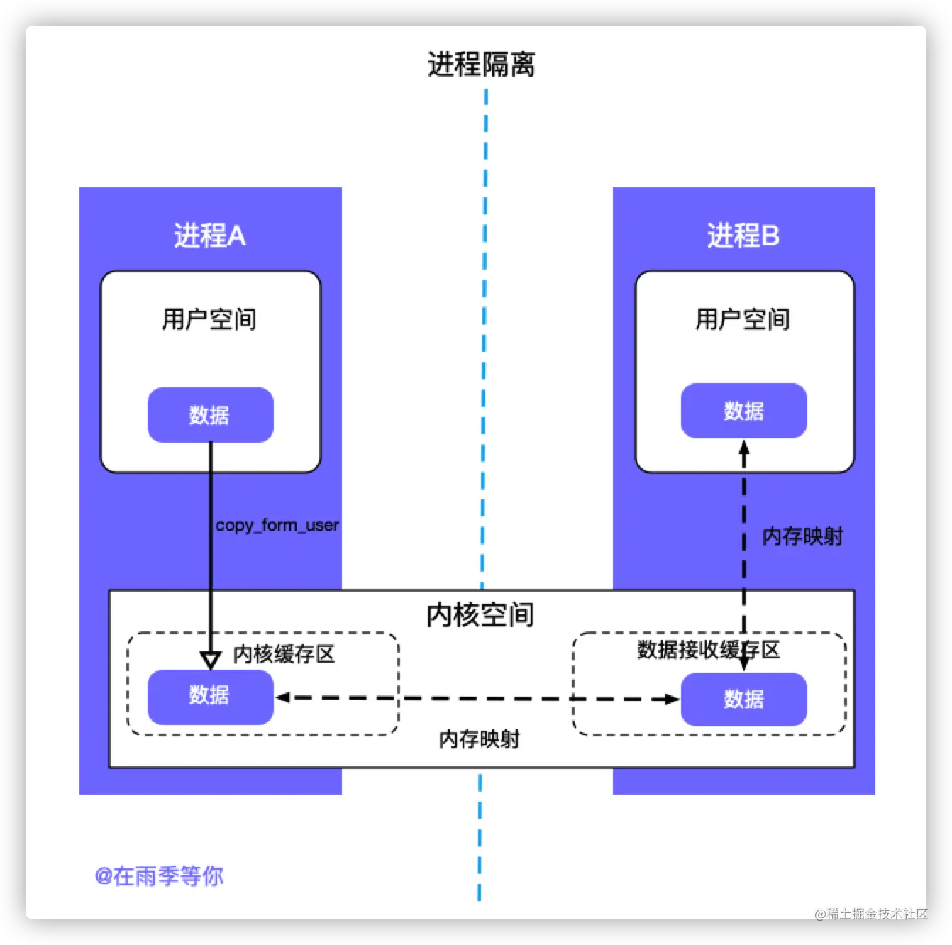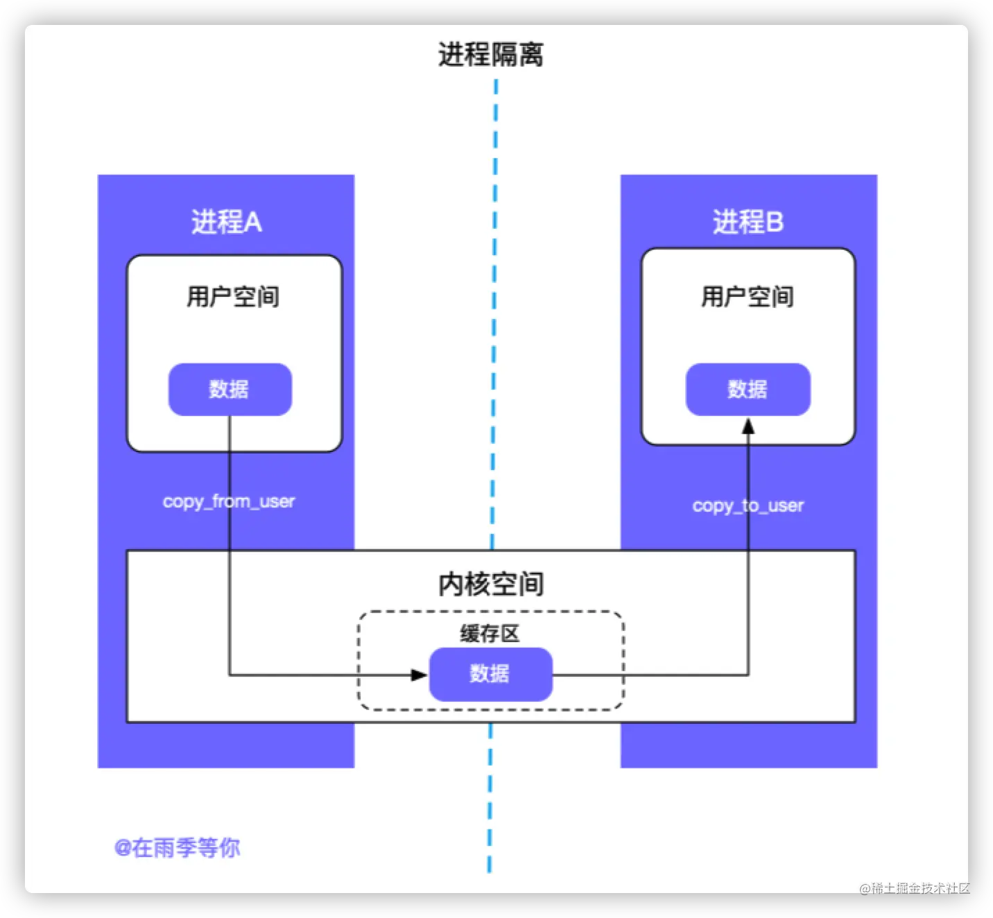 Linux IPC通信的过程,进程A通过copy_from_user的函数将数据拷贝到内核空间的缓冲区,内核空间通过copy_to_user的函数将数据在拷贝给进程B,一共经历了2次数据拷贝,其过程如下图