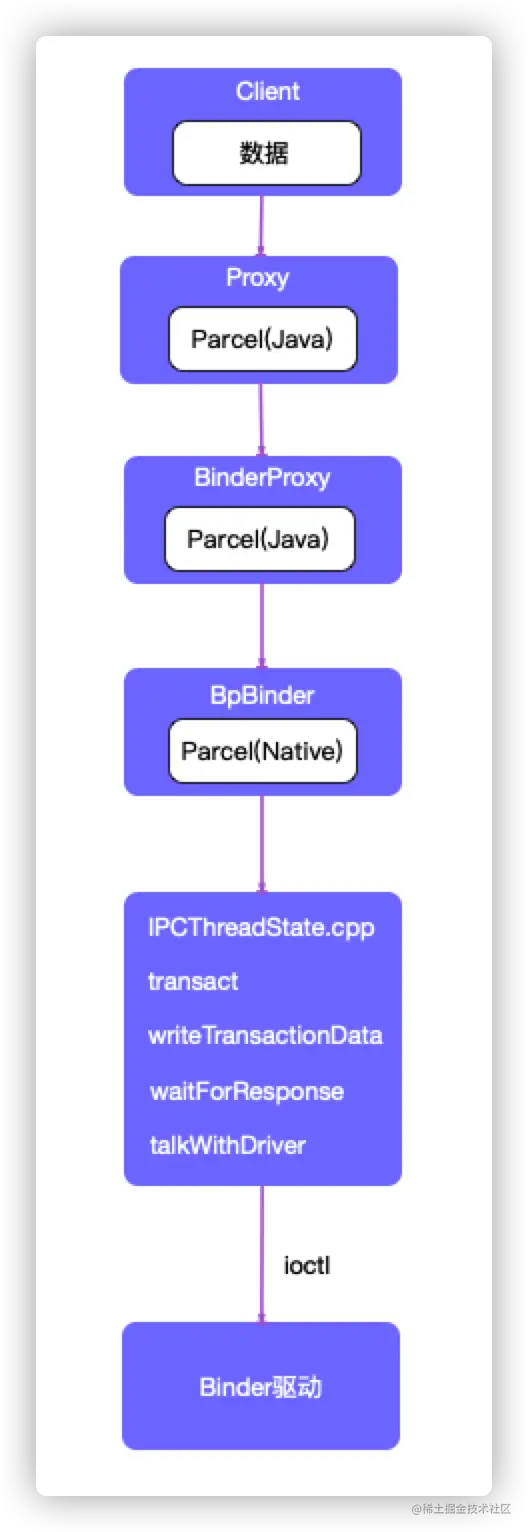 数据继续往下层传递。此时就进入Navite层,在这里原先的Java层Parcel就转成了native的Parcel。通过BpBinder将数据传入到IPCThreadState中进行处理,处理的方式是将原先native的数据通过memcpy进行复制,保存在mOut变量中。这个mOut 也是一个Parcel对象。最终走到 ioctl 方法 调用驱动层的代码.将数据进行内存映射。