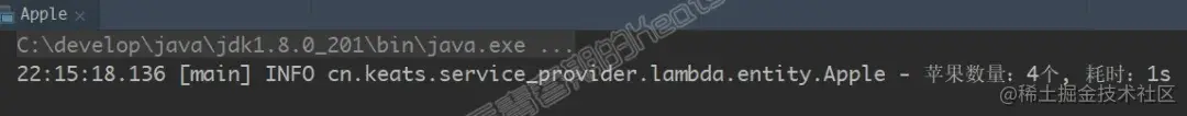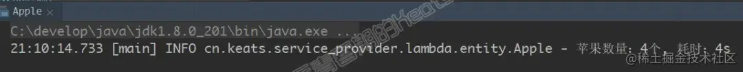 log.info("苹果数量:{}个, 耗时:{}s", appleList.size(), (end.getTime() - begin.getTime()) /1000);
