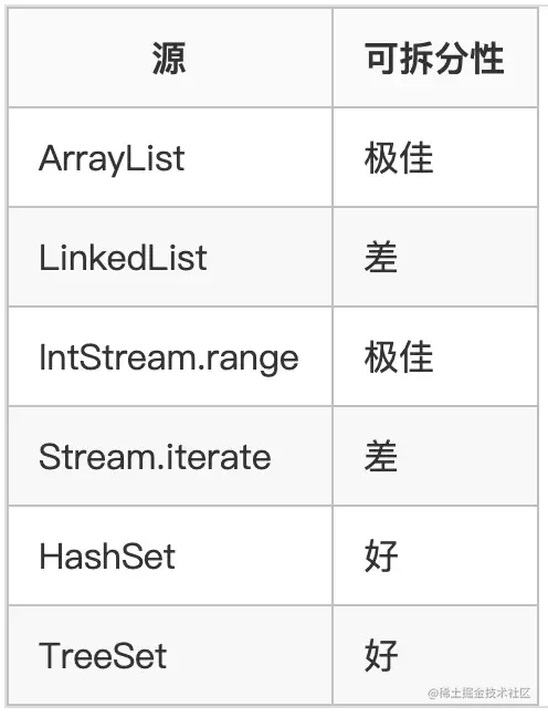 以下是一些常见的集合框架对应流的可拆分性能表: