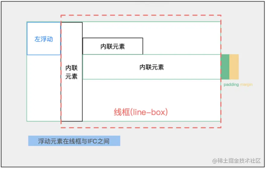 - 一般来说,行框的左边界紧挨着包含容器的左边界,行框的右边界紧挨着包含容器的右边界(两个边都是紧挨着的)。然而,浮动盒子可能存在于包含边框边界和行框边界之间