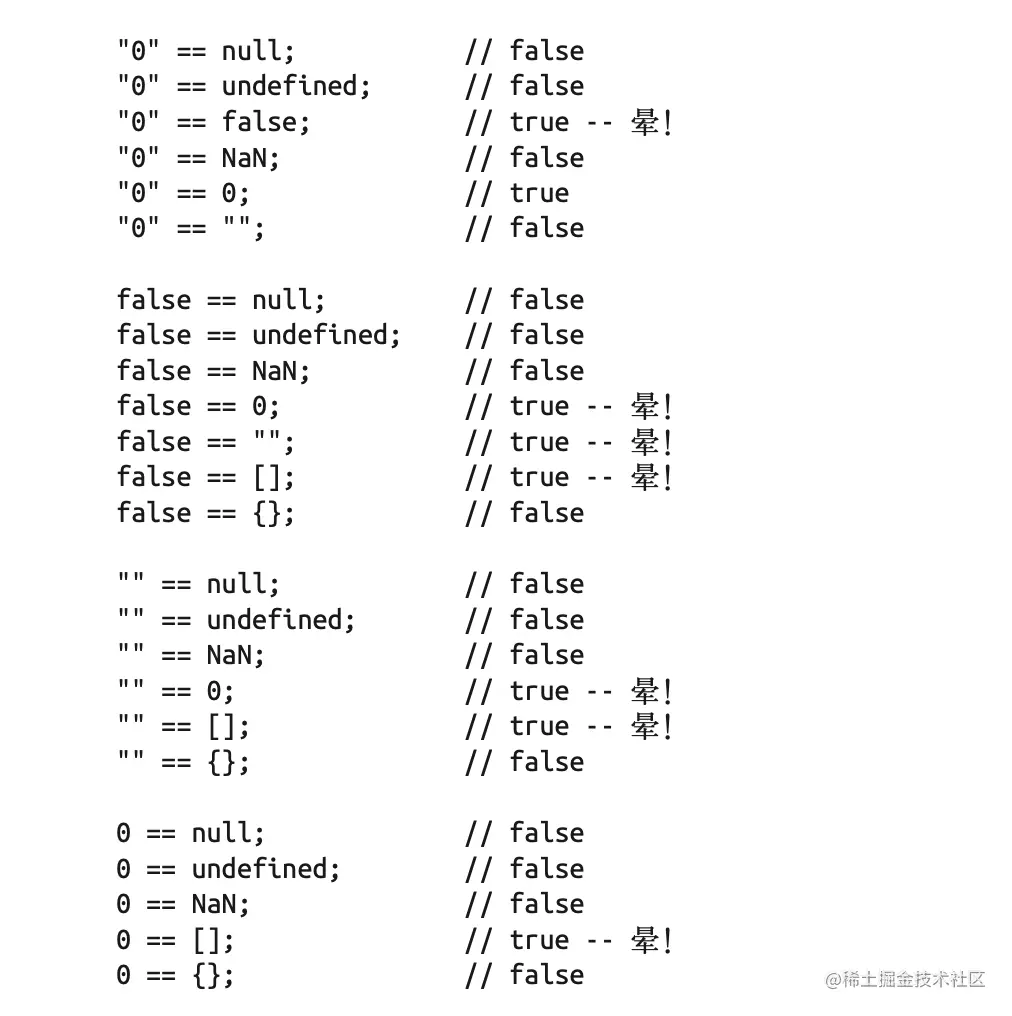 • 如果两边的值中有 []、"" 或者 0,尽量不要使用 ==。