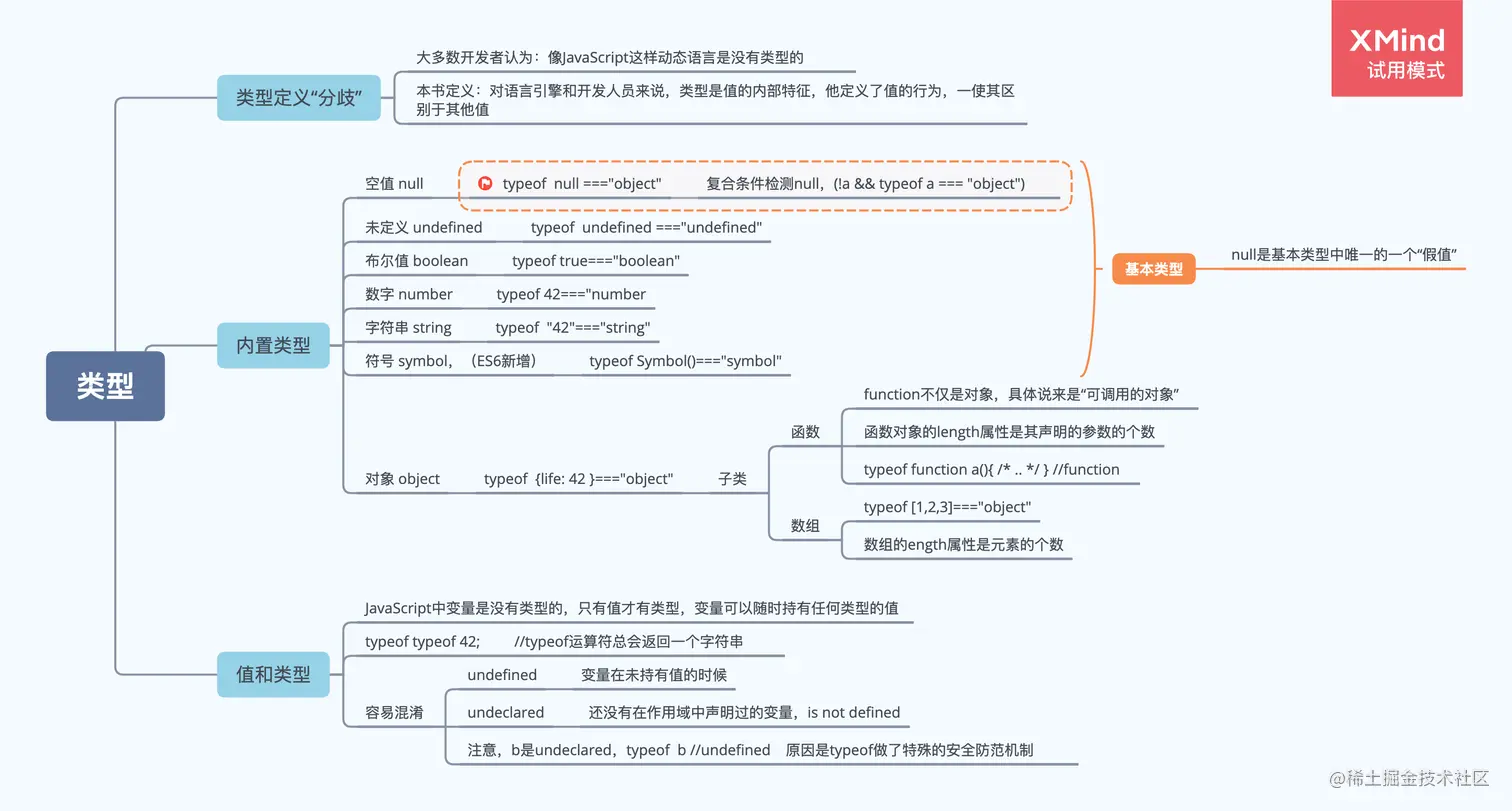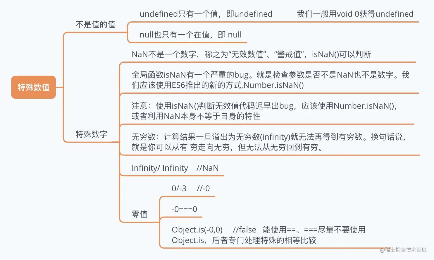 基本类型中定义了几个特殊的值。null 类型只有一个值 null,undefined 类型也只有一个值 undefined。所有变量在赋值之 前默认值都是 undefined。void 运算符返回 undefined。数字类型有几个特殊值,包括 NaN(意指“not a number”,更确切地说是“invalid number”)、+Infinity、-Infinity 和 -0。