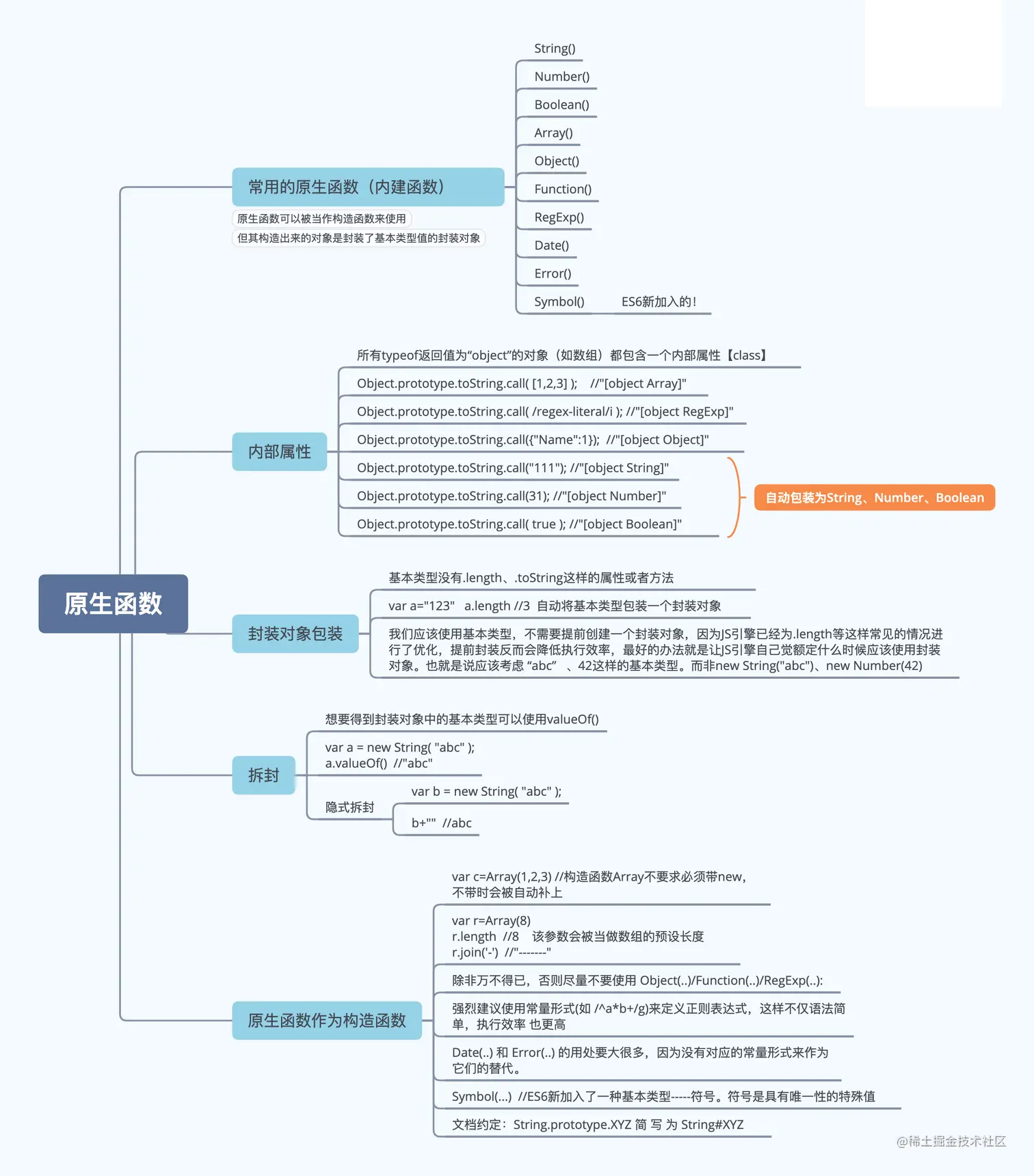 JavaScript 为基本数据类型值提供了封装对象,称为原生函数(如 String、Number、Boolean 等)。它们为基本数据类型值提供了该子类型所特有的方法和属性(如:String#trim() 和 Array#concat(..))。