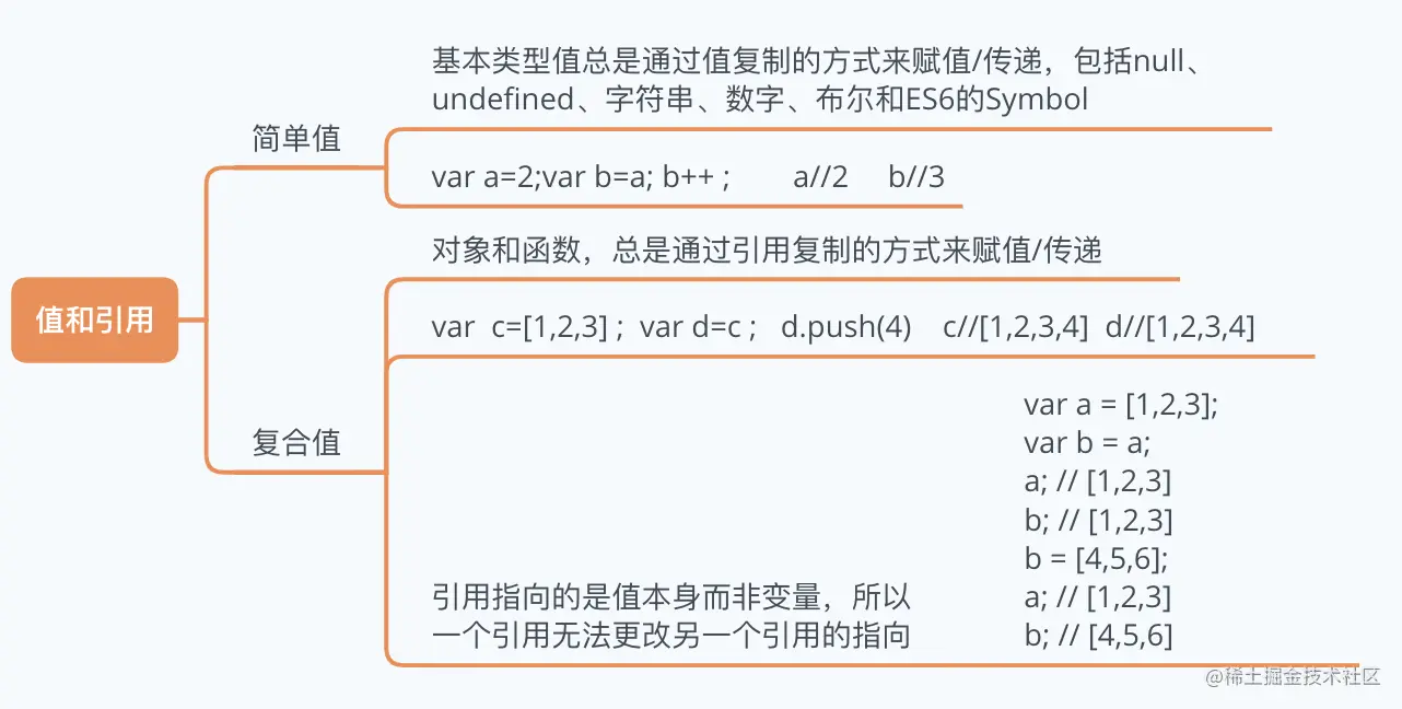 简单标量基本类型值(字符串和数字等)通过值复制来赋值 / 传递,而复合值(对象等) 通过引用复制来赋值 / 传递。JavaScript 中的引用和其他语言中的引用 / 指针不同,它们不 能指向别的变量 / 引用,只能指向值。