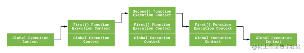首先生命first入栈,之后生命second入栈,之后执行first但是first中执行了second,second执行完出栈,之后执行完first。