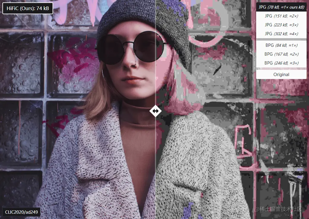 左边是 HiFiC 算法压缩效果,右边是同等体积 JPG 格式图片的效果。