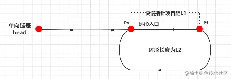 即:初始状态为如下图,慢指针Ps在环形入口出,快指针Pf在环形区域中距离入口L1的地方。那么,在这种状态下求Pf、Ps在环形区域,他们相遇的节点在哪里呢?
