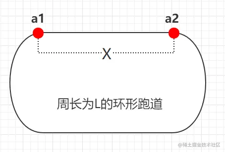题:有一个长度为L的环形跑道,在跑道上有两个人a1、a2,他们的速度分别为v、2v。其中,a1在起点,a2在距离起点x米的地方,求他们相遇的点。其中x<L。