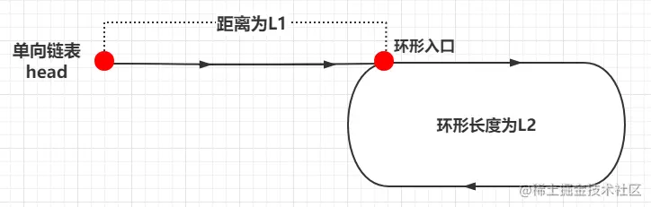快慢指针,在环形区域相遇后,距离入口距离